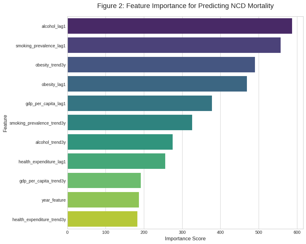 In this study, we built and validated a machine learning model capable of predicting national NCD mortality rates three years ahead with strong accuracy. The findings offer two major insights. First, the most predictive factors are recent, measurable health behaviours—specifically alcohol consumption and smoking prevalence. Second, a condition’s direction of change can be more revealing than its static value; the fact that the 3-year obesity trend outperformed the 1-year lag implies that the pace of the obesity crisis is a key early warning indicator.